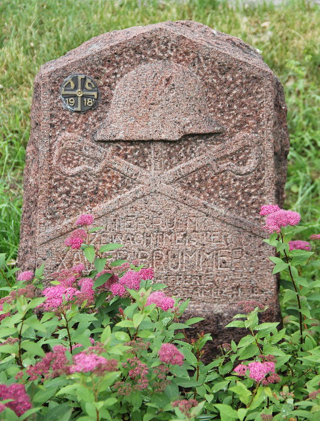 Den tyska soldatens grav. Ville Vallgren/Guido Eriksson, 1923. Stenens text: “Hier Ruht Vizewachtmeister Xavier Brummer Bay. Geb.batterie 12 Geb. am 30.3.1891. gest. am 12.4.1918. in treuem gedenken Alberga Schutzkorps”